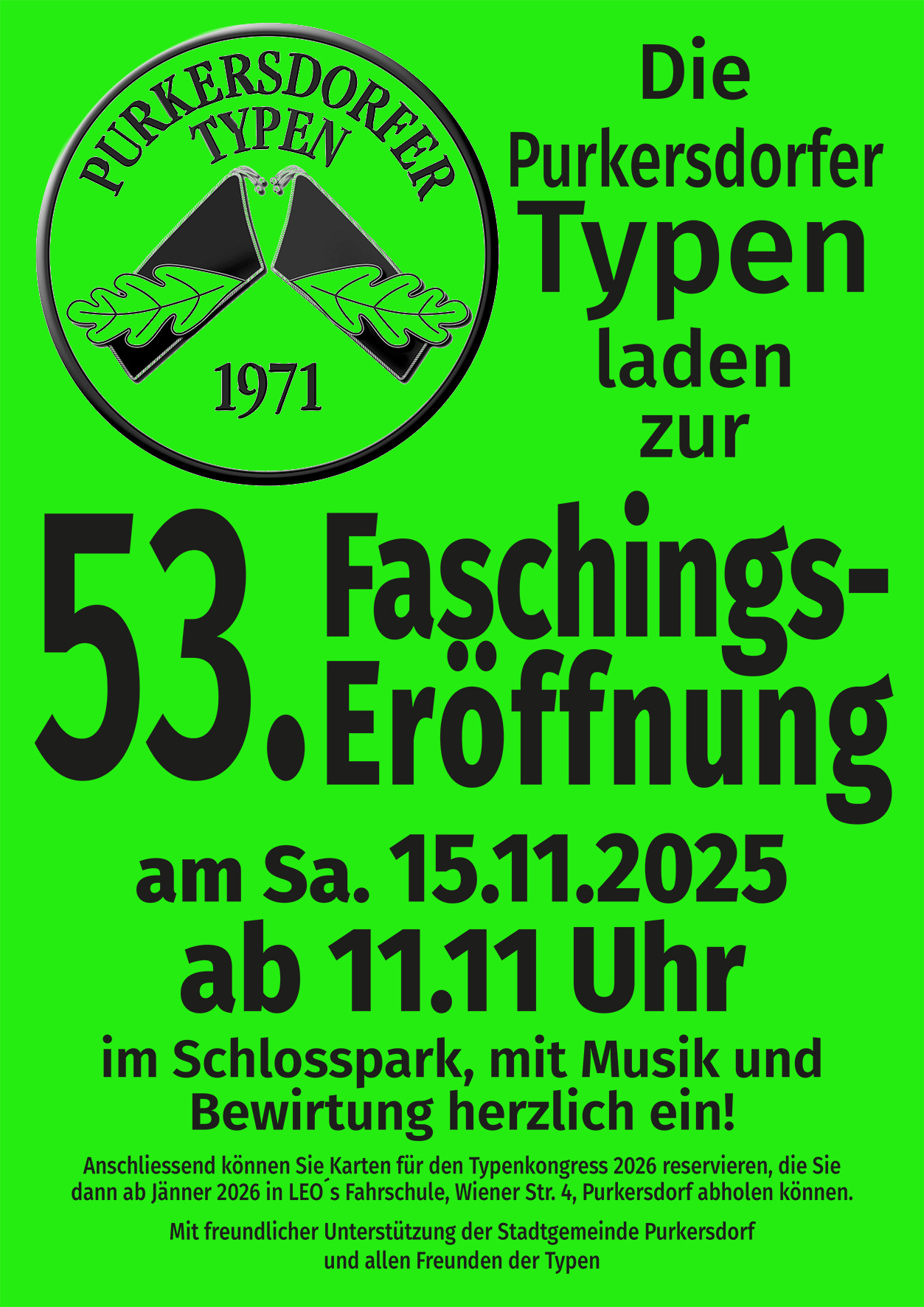 Am Sa. den 15.11.2025 ab 11:11 Uhr findet die jährliche Faschingseröffnung statt. Die Purkersdorfer Typen freuen sich auf euer kommen.